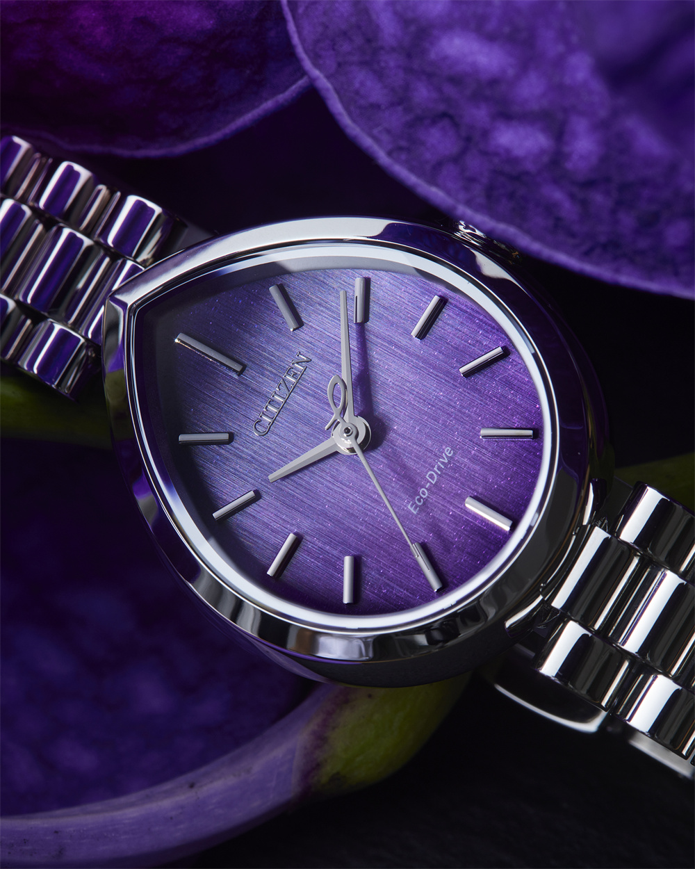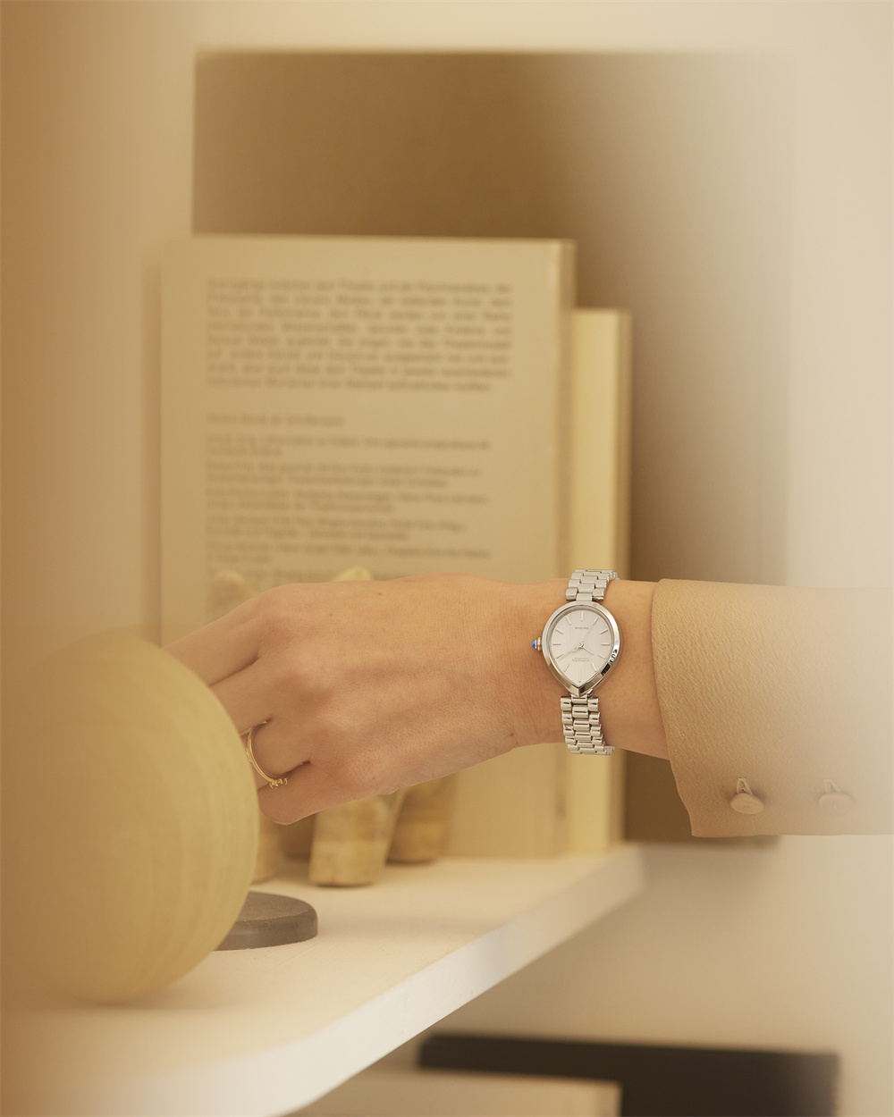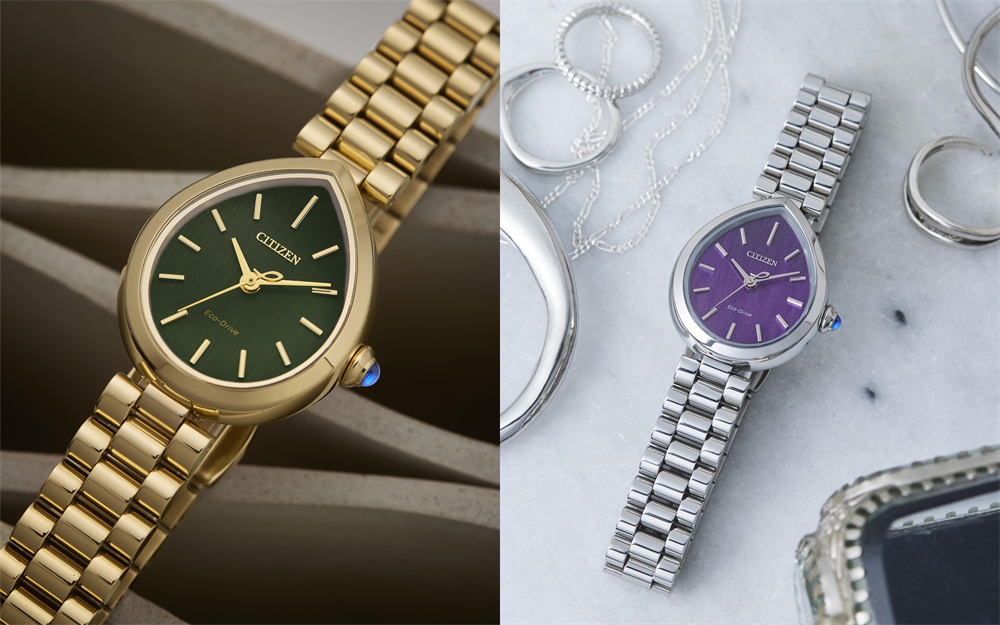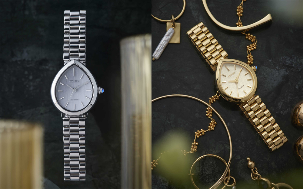 Rainell的辨识度,首先来自其对传统女士腕表造型的温柔反叛。当市场上充斥着圆润乖巧的圆形表壳或冷硬利落的方形轮廓,西铁城唤醒了水滴这一被忽视的自然形态。表壳轮廓并非简单的椭圆,而是呈现一端圆润收拢、一端微微垂坠的流动感,仿佛一滴雨正欲滑落叶片却又被时光定格的刹那。这种非对称曲线在佩戴时会产生有趣的视觉效果:从不同角度望去,表壳轮廓会随手腕转动呈现微妙变化,有时圆润饱满,有时修长利落。一如现代女性本身——柔软与坚定并存,在不同的场合、不同的角色中,展现出不同的面貌。